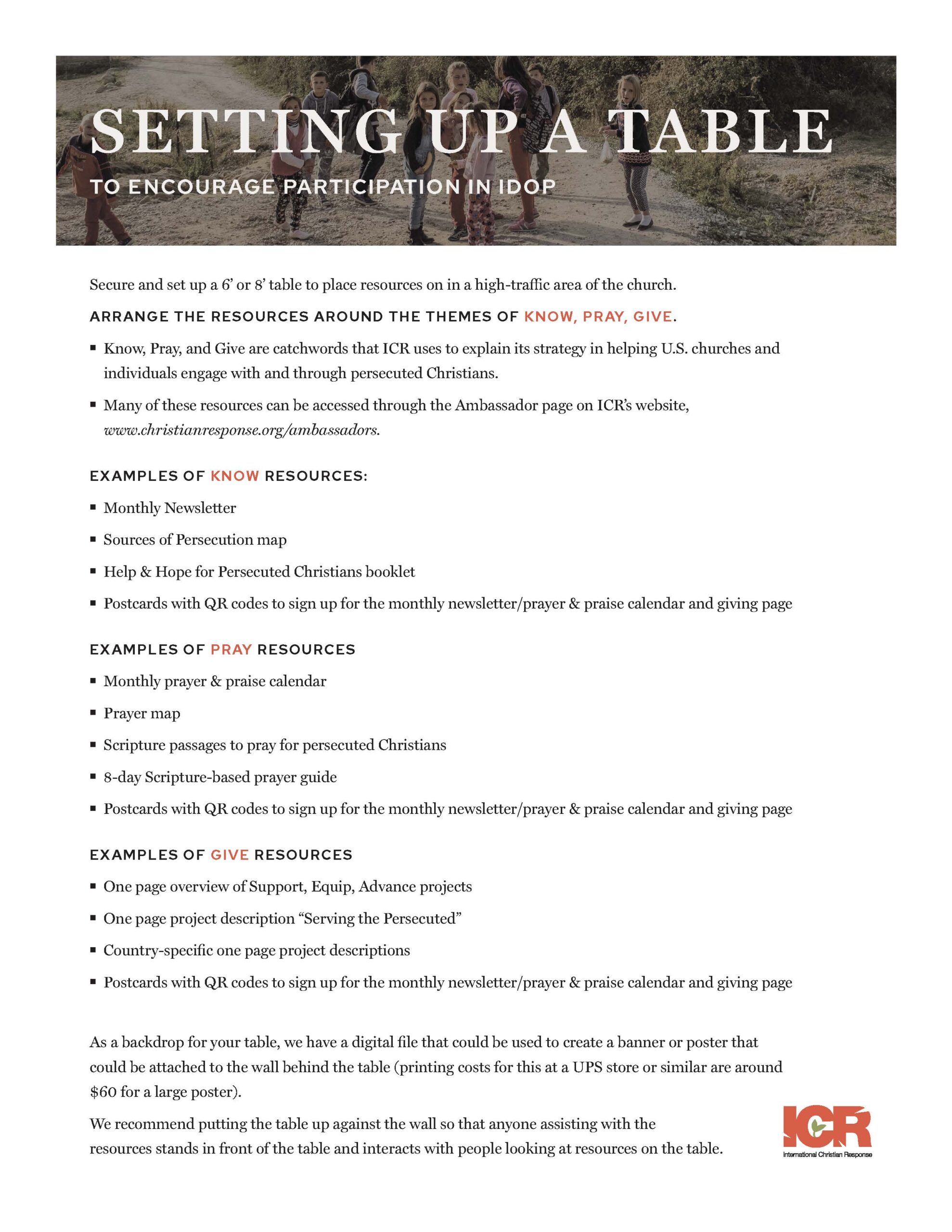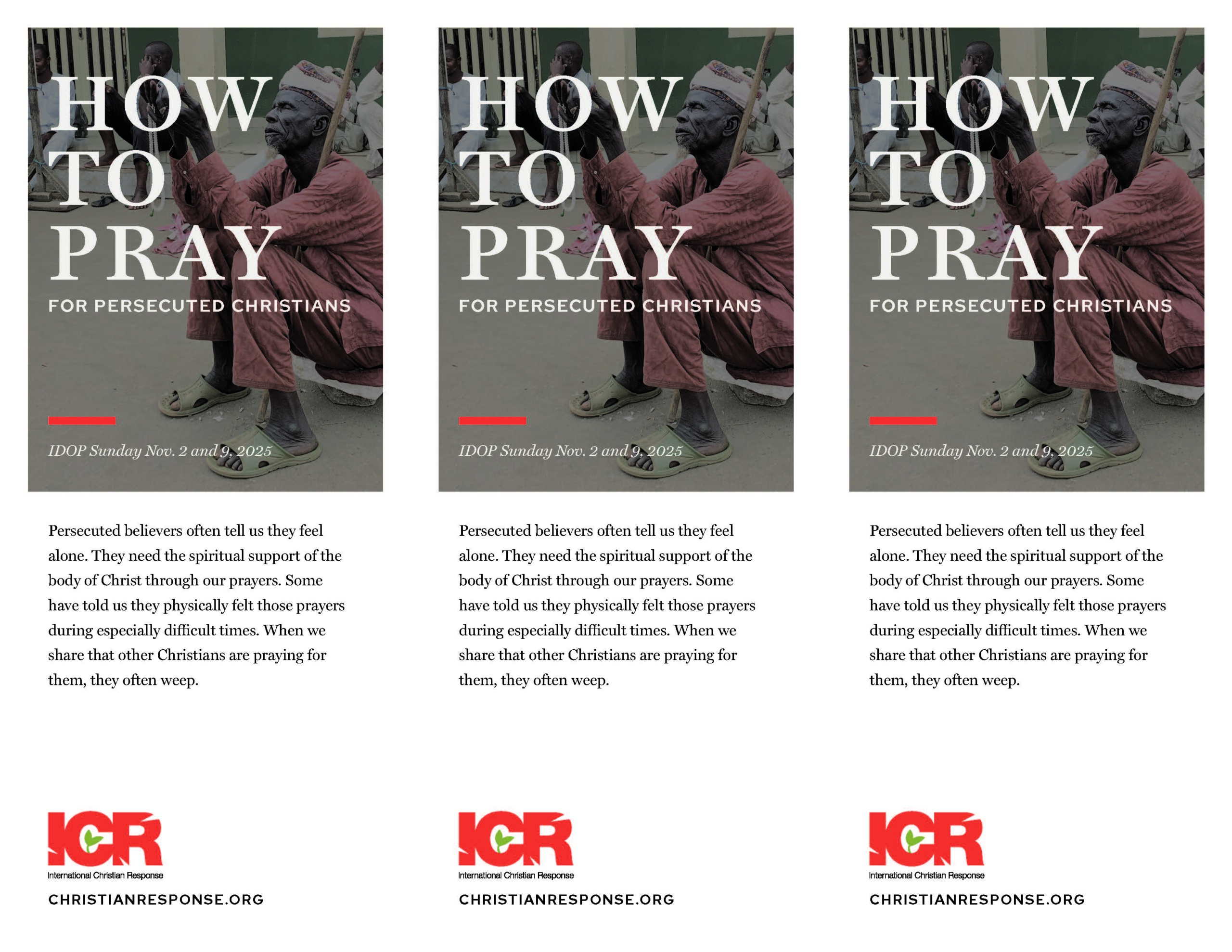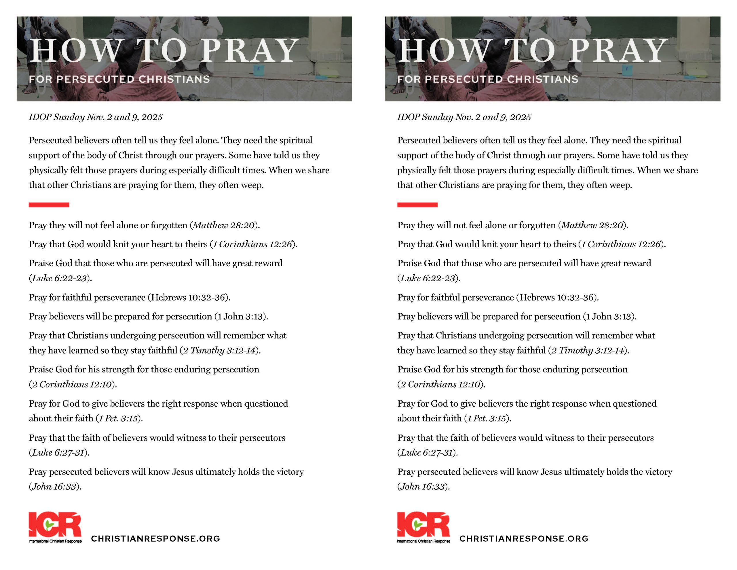 International Day of Prayer: Nov 2 and 9, 2025 Join us in prayer for persecuted Christians. See IDOP Resources IDOP Resources PowerPoint Template 8-day Devotional IDOP Sunday Video Church Bulletin Insert Teen Resources 60-Second Promo Video Setting up a Resource Table How to Pray Video How to Start Printable Poster Learning Resource Printable Poster Project Descriptions Printable Prayer Bookmarks Printable QR Code for Table 3-Minute Video How ICR Helps Printable QR Code for Table Kids Prayer Map Logo for Bulletins
